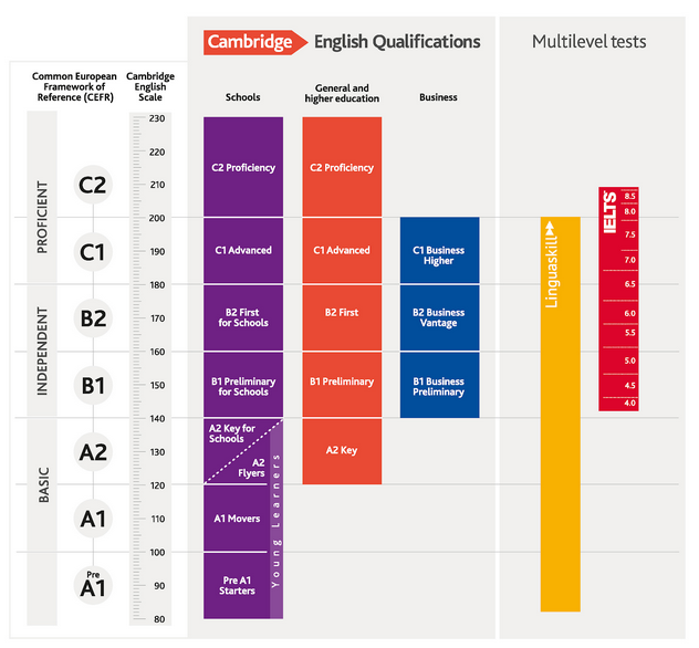 Para aprobar los distintos exámenes, necesitás obtener la siguiente mínima puntuación para cada uno según la escala de Cambridge English.